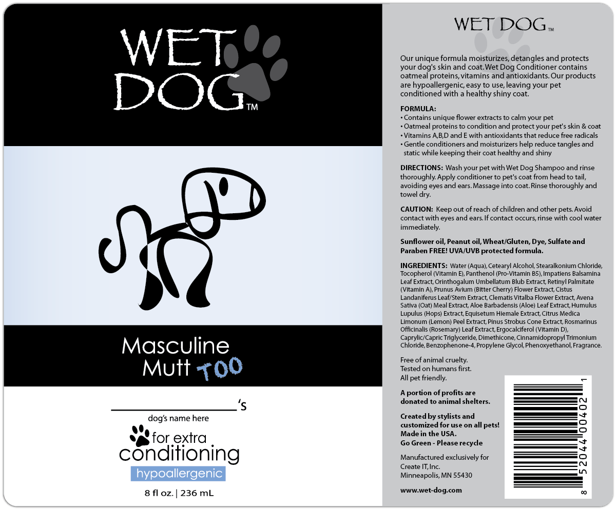 Finish bath time with a calming touch. Wet Dog Masculine Mutt Calming Dog Conditioner softens the coat, reduces tangles, and helps soothe anxious pups. Paired with Masculine Mutt Shampoo, this conditioner leaves your dog smelling fresh, feeling silky, and enjoying a relaxed grooming experience.